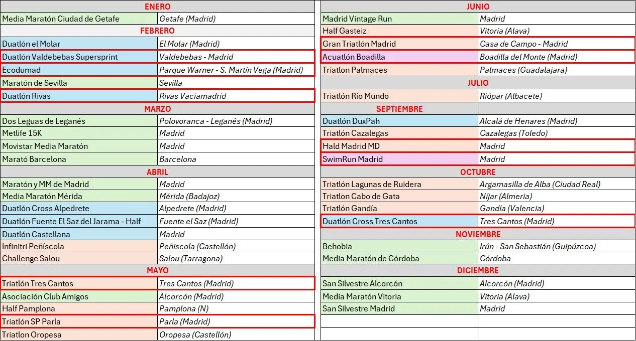 Enmarcadas en rojo las pruebas oficiales de la Federación Madrileña de Triatlón.